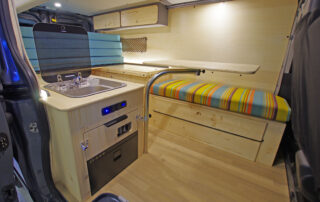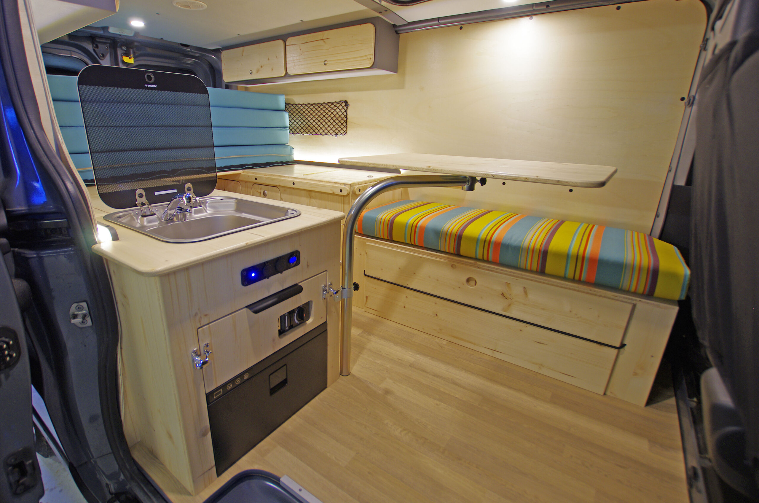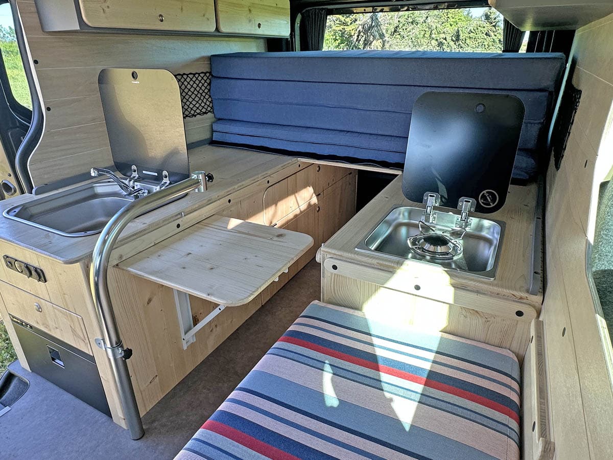 Bien-sûr pour encore plus de confort vous pourrez toujours opter pour la version 2 places avec embase pivotante sur le siège passager.SIMPLICITE : Une fois assis sur la banquette, ne bougez plus, l’essentiel est à portée de main dans le Van : réfrigérateur, évier, réchaud, vaisselle, table, prise USB. Les éléments essentiels sont également tous accessibles de l’extérieur pour une utilisation mixte intérieur/extérieur facile.